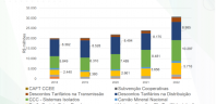 Entre os subsídios por tipo, a fonte incentivada fica com 29,65%, geração distribuída com 25,93%, CCC com 22,83%, a tarifa social ficou com 11,61%, irrigação e aquicultura com 3,16%, universalização com 2,86%, carvão e óleo com 2,38% e distribuidora pequeno porte com 1,77%.